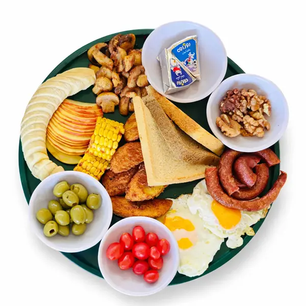2 عدد نیمرو، چوریتسو (سوسیس 95%)، سیب سوخاری، قارچ، ذرت، پنیر، گردو، زیتون، گوجه گیلاسی، میوه فصل، نان تست
